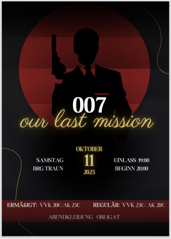 Unter dem Motto „007 – our last mission“ laden wir, die diesjährigen 8. Klassen des BRG Traun, zum Maturaball ein. Traditionsgemäß findet dieser in den Räumlichkeiten der Schule (Schulstraße 59, 4050 Traun) statt. Gemeinsam mit euch wollen wir eine unvergessliche Ballnacht feiern. Am Samstag, den 11. Oktober 2025, ab 19 Uhr geht es los. Um 20 Uhr startet der Ball mit der Eröffnung durch die Maturant_innen. Neben Live-Musik, unterschiedlichsten Bars und unserer Tombola wird die Mitternachtseinlage das Highlight des Balls sein. Die Lehrkräfte haben sich auch dieses Jahr gewaltig ins Zeug gelegt und gestalten einen Teil dieser Einlage.